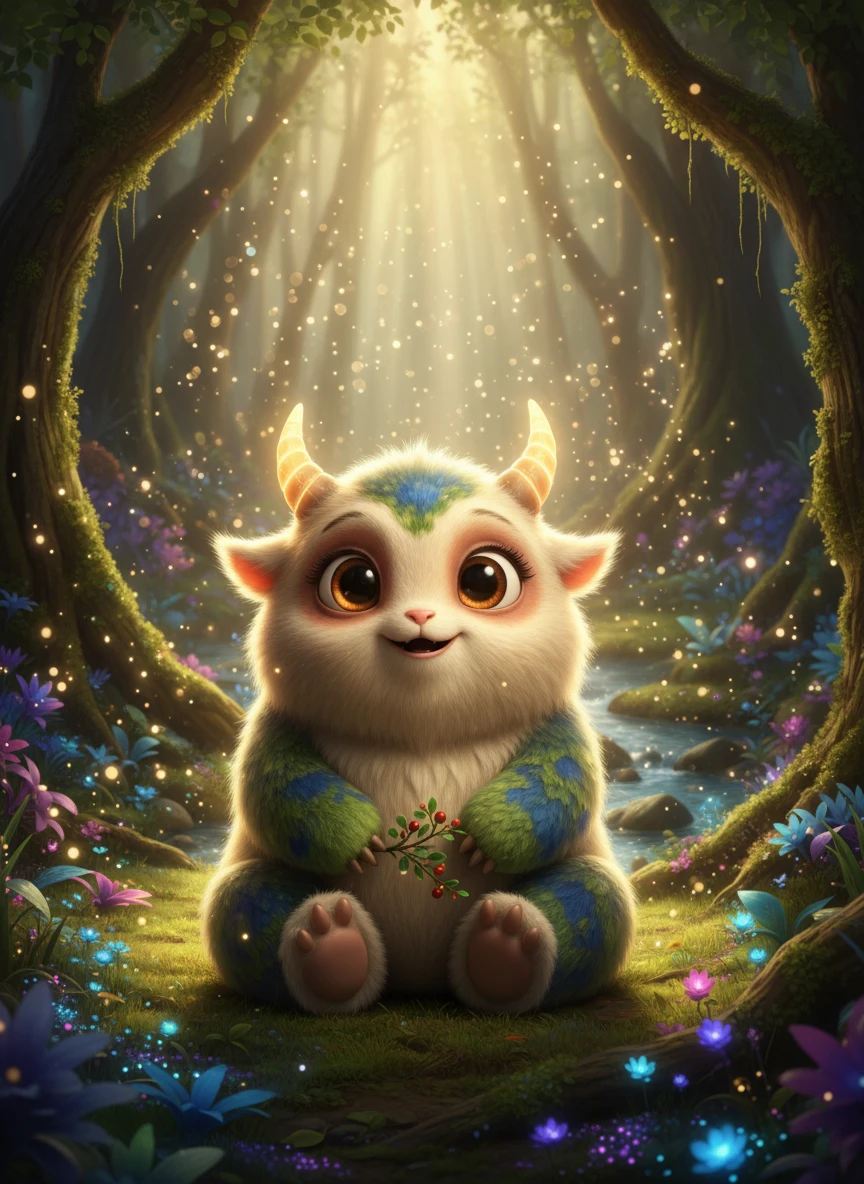 Magical Creature Companion. A charming fantasy creature rendered in a disney-pixar generator look, with soft fur, big expressive eyes, and rounded shapes. The creature is sitting in a glowing forest clearing, surrounded by floating sparkles and gentle light rays. The scene feels magical, friendly, and suitable for a family animated movie. Style: disney-pixar generator, fantasy animation, soft glow, cute character NEG: realistic animal anatomy, aggressive pose, dark fantasy, sharp edges, horror style, oversaturation