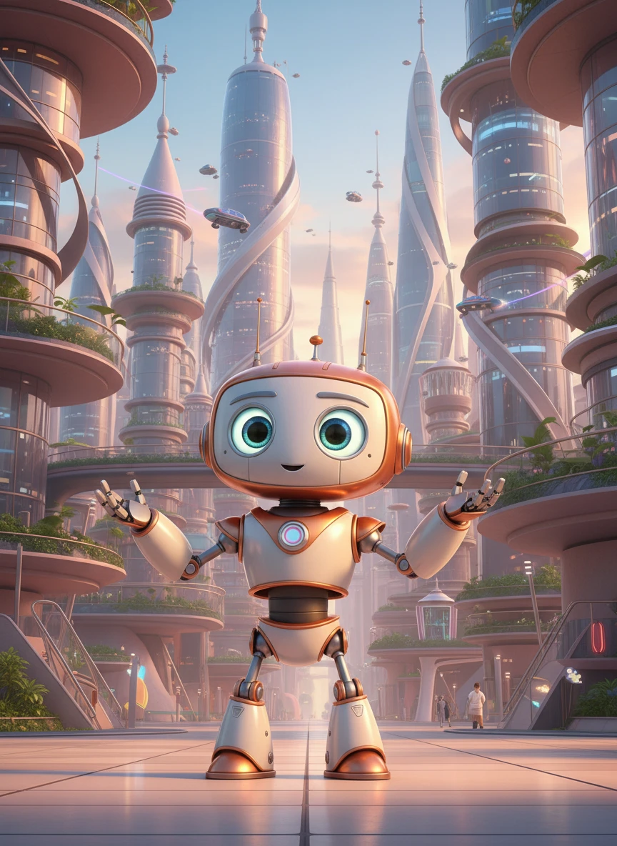 Robot with Heart. A cute robot character designed in a disney-pixar generator style, with rounded metal shapes, big glowing eyes, and expressive body language. The robot stands in a clean futuristic city with soft lighting and colorful accents. The mood is hopeful and emotional, blending technology with warmth. Style: disney-pixar generator, animated sci-fi, cute robot, soft lighting NEG: hard sci-fi realism, sharp mechanical detail, dark cyberpunk, gritty textures, noise, text