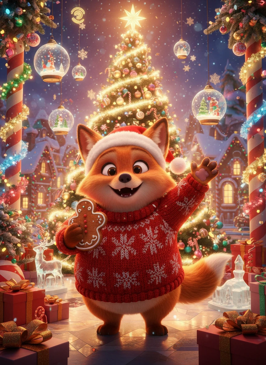 Seasonal Holiday Moment. A festive animated scene in a disney-pixar generator aesthetic showing a character enjoying a holiday celebration with decorations and lights. The character’s expression is joyful, with exaggerated features and smooth shading. The environment feels magical, cheerful, and family-friendly. Style: disney-pixar generator, festive animation, warm glow, joyful NEG: realistic faces, gloomy mood, dark shadows, clutter, low saturation, distortion