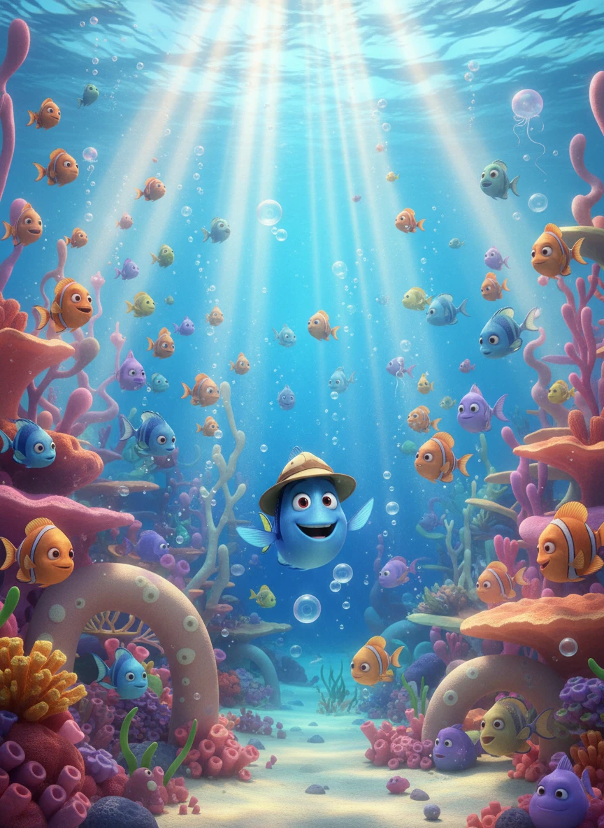 Underwater Animated World. A lively underwater scene created in a disney-pixar generator look, filled with colorful fish characters and coral shaped in soft, rounded forms. The main character smiles while swimming through glowing blue water with light beams from above. The tone is fun, friendly, and visually rich without realism. Style: disney-pixar generator, underwater animation, bright colors, playful NEG: realistic marine biology, scary sea creatures, dark tones, murky water, sharp realism, artifacts