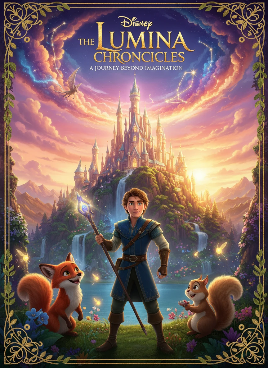 Create a magical animated movie poster using a disney poster generator, featuring a brave young hero standing before a glowing fantasy castle at sunset. The composition is whimsical and family-friendly, with expressive characters and a sense of wonder. Soft lighting, vibrant colors, and cinematic framing evoke classic animated storytelling. Style tags: animated fantasy, cinematic poster, whimsical — NEG: blurry, photorealistic, dark horror, distorted faces, text errors, low contrast, dull colors