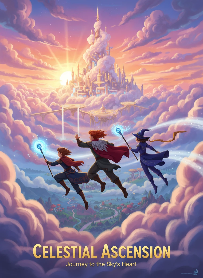 Design an adventurous animated poster with a disney poster generator, showcasing heroes flying through the sky toward a majestic cloud city. The camera angle is dynamic and cinematic, creating a sense of movement and scale. Bright colors and stylized clouds enhance the epic yet playful mood. Style tags: epic animation, sky fantasy, cinematic — NEG: flat composition, realism, dull sky, stiff poses, overexposed highlights