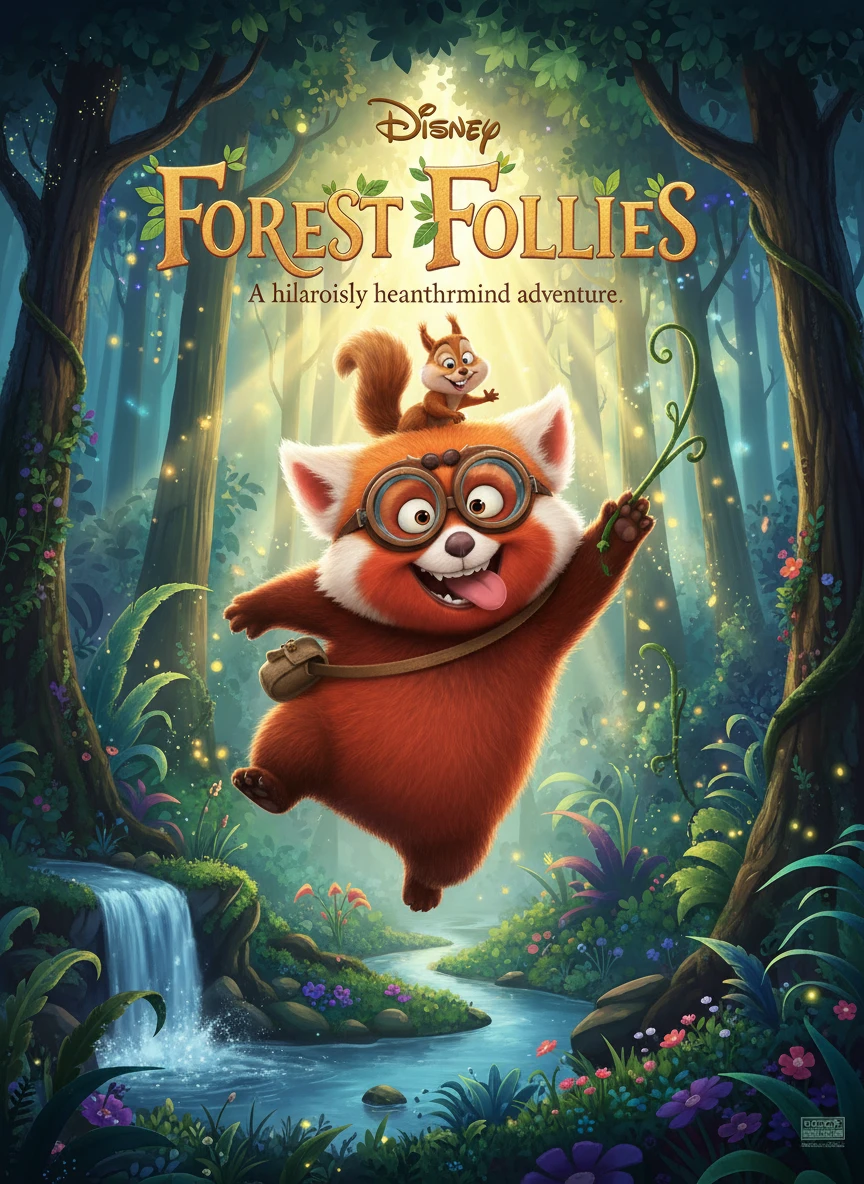 Generate a charming animated movie poster using a disney poster generator, centered on a cute animal hero in an adventurous pose. The background suggests a lush forest with depth and playful lighting. The expression and pose should feel humorous, lovable, and emotionally engaging. Style tags: animated character, family comedy, colorful — NEG: scary, hyperreal, dull lighting, flat shading, deformed anatomy, aggressive mood