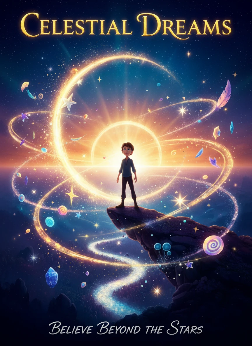 Create an inspirational animated movie poster with a disney poster generator, portraying a young dreamer looking toward a glowing horizon. Symbolic elements like stars, light trails, and whimsical shapes float around the character. The mood is uplifting, hopeful, and cinematic. Style tags: inspirational animation, cinematic fantasy, glowing light — NEG: dark mood, photorealism, noise, washed-out colors, distorted proportions