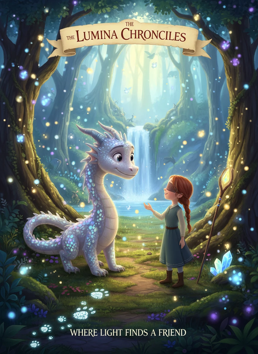 Illustrate a heartwarming animated poster using a disney poster generator, depicting two unlikely friends meeting in a glowing enchanted forest. The lighting is soft and magical, with floating lights and expressive faces. The overall tone is emotional, hopeful, and family-oriented. Style tags: emotional animation, fantasy forest, soft glow — NEG: horror elements, harsh contrast, photorealism, lifeless expressions, messy background