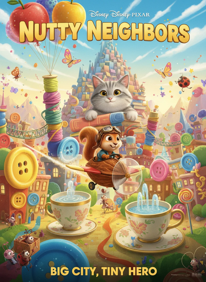 Generate a playful animated poster with a disney poster generator, showing a tiny hero exploring a colorful oversized city. Perspective exaggeration adds charm and humor, with lively background details. The tone is adventurous, lighthearted, and visually rich. Style tags: animated adventure, playful scale, colorful city — NEG: realistic city, dull palette, cluttered layout, blur, lifeless scene