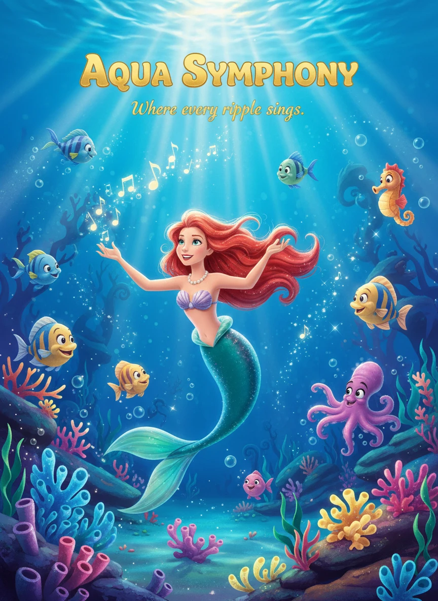 Create a vibrant underwater animated poster with a disney poster generator, featuring a joyful character swimming among glowing coral and friendly sea creatures. The scene feels musical and lively, full of motion and sparkle. Use rich blues, teals, and light rays for depth and magic. Style tags: underwater fantasy, musical animation, vibrant — NEG: murky water, realism, noise, low detail, dark tones, broken perspective