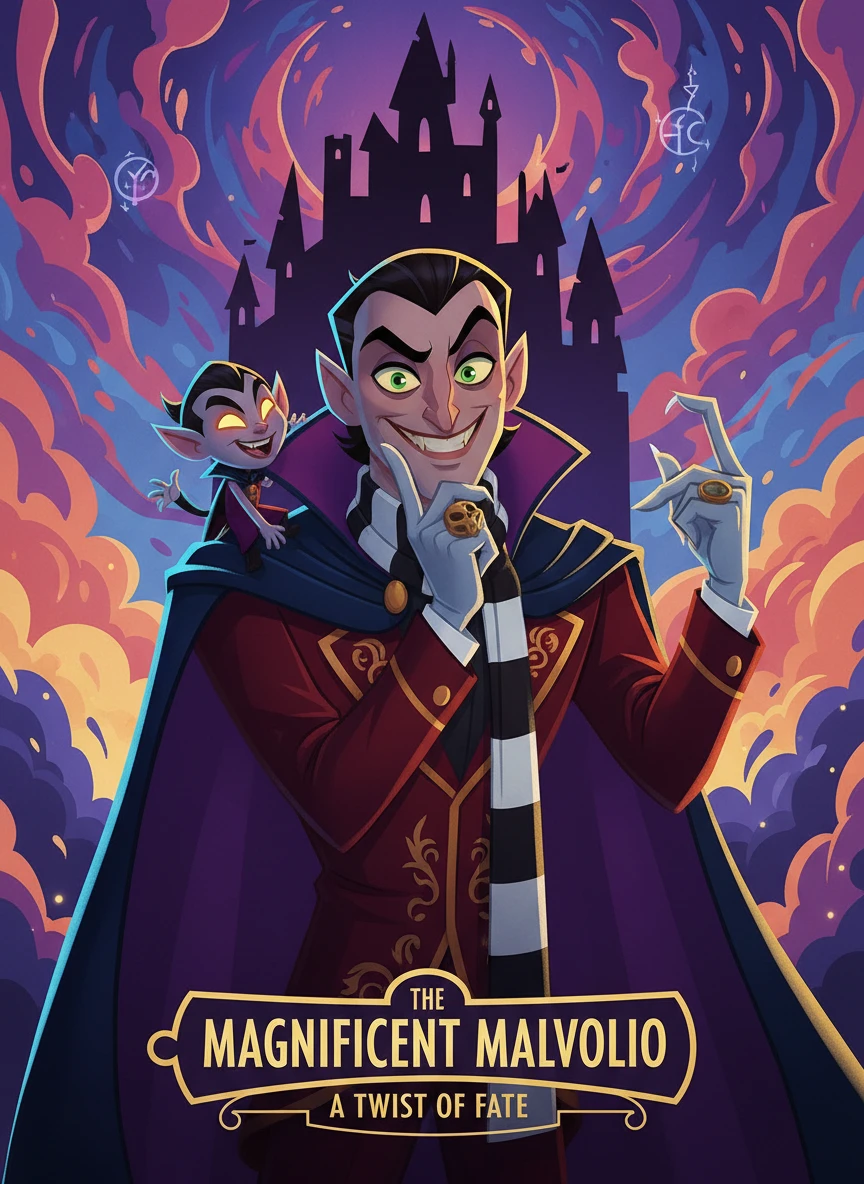 Create a stylized animated poster using a disney poster generator, focusing on a charismatic villain with dramatic lighting and expressive emotion. The design balances menace and charm, hinting at humor and depth. Bold colors and clean shapes keep it approachable and fun. Style tags: animated villain, dramatic lighting, character focus — NEG: scary horror, hyper-detailed skin, realism, messy linework, unreadable expression