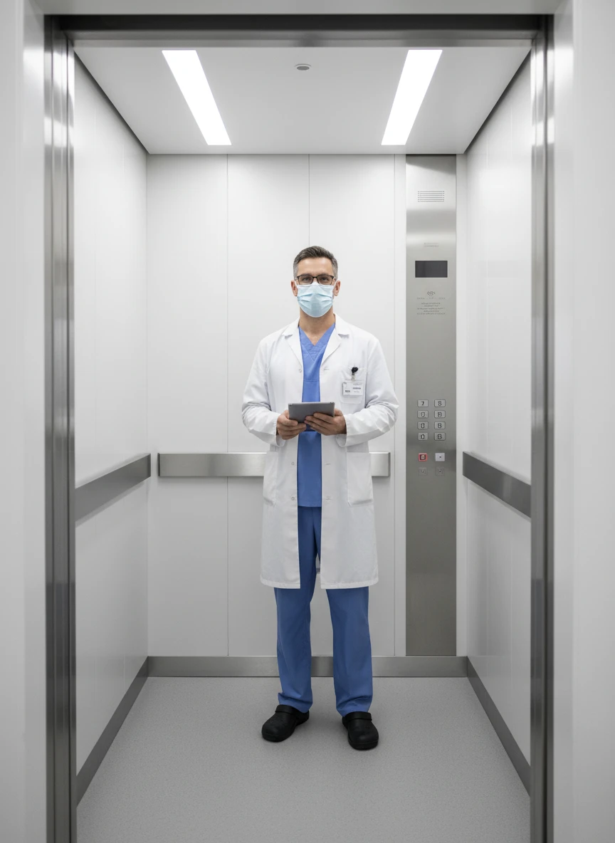 AI Elevator Photo Generator capturing a hospital elevator with clean white walls and clinical lighting. A medical professional stands inside, conveying a calm, professional mood with realistic detail. The composition is straightforward and documentary-like. Clinical realism, neutral tones, sharp focus — NEG: dramatic lighting, fantasy elements, blur, noise, text overlay, watermark, distortion