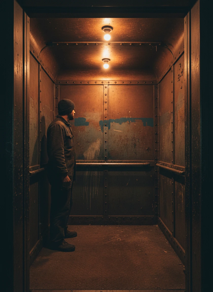AI Elevator Photo Generator producing a moody elevator interior in an old industrial building. Rusted metal panels, exposed bolts, and dim tungsten lighting create a gritty urban atmosphere, with a lone subject standing in profile. The composition feels documentary-style, capturing raw textures and subtle shadows. Gritty realism, cinematic lighting, urban — NEG: fantasy style, neon colors, CGI look, blur, noise, artifacts, watermark