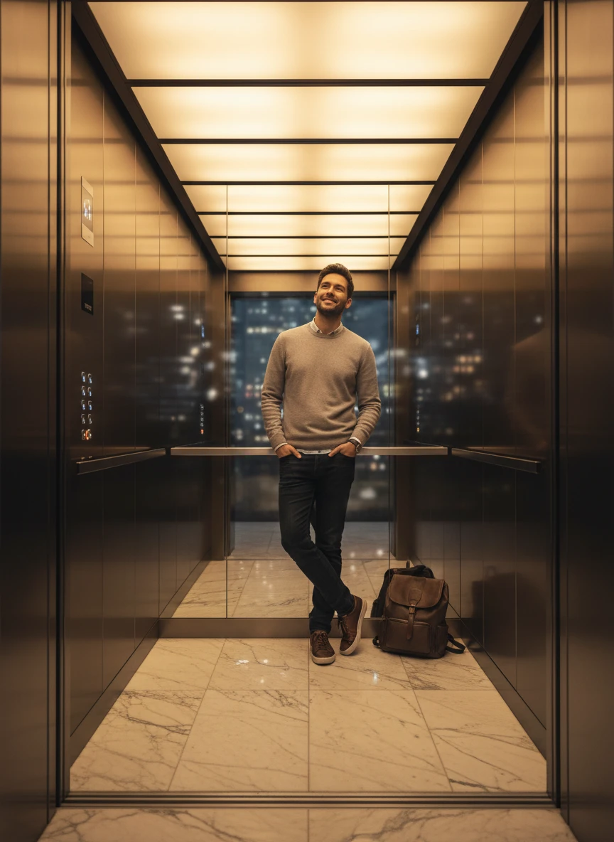 AI Elevator Photo Generator illustrating a luxury residential elevator with marble floors and soft ceiling lights. A relaxed individual in casual wear creates a lifestyle photography vibe, with balanced composition and natural posture. The image feels aspirational yet grounded in realism. Lifestyle photography, elegant, realistic — NEG: cartoon, overexposed highlights, blur, fake textures, watermark, text, artifacts