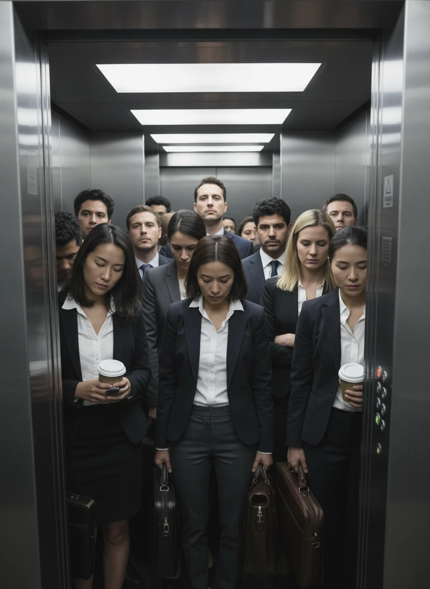 AI Elevator Photo Generator creating a crowded office elevator during morning rush hour. Multiple people in business attire stand close together, captured with natural expressions and candid realism. Neutral lighting and eye-level framing give the scene an authentic corporate atmosphere. Documentary style, realistic, natural light — NEG: exaggerated faces, blur, cartoon, oversaturated colors, artifacts, watermark, text