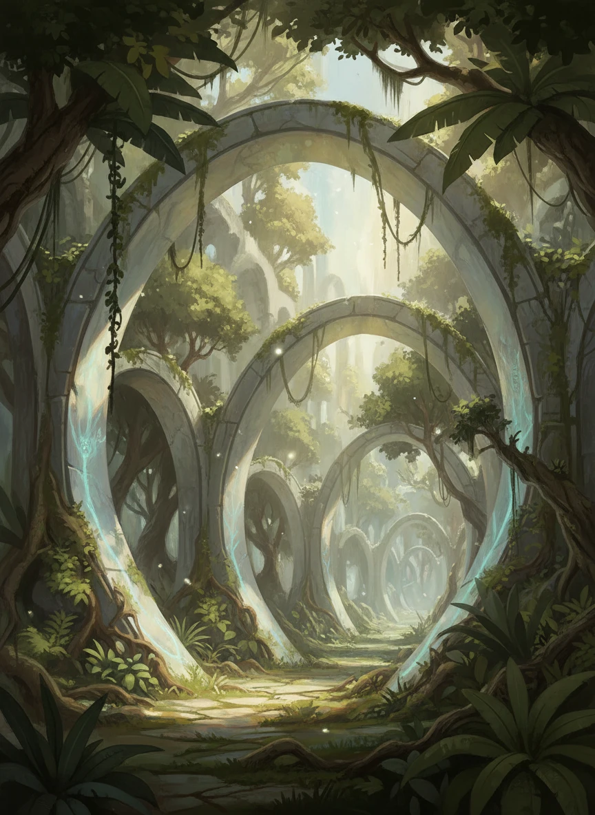 Overgrown elven ruins emerge from jungle vines, portrayed with fantasy art generator elegance. Marble arches glow faintly with lost magic as sunlight filters through leaves. The tone is ancient, peaceful, and mysterious. fantasy ruins, soft light, atmospheric — NEG: harsh contrast, cluttered scene, modern elements, blur, noise, text, watermark