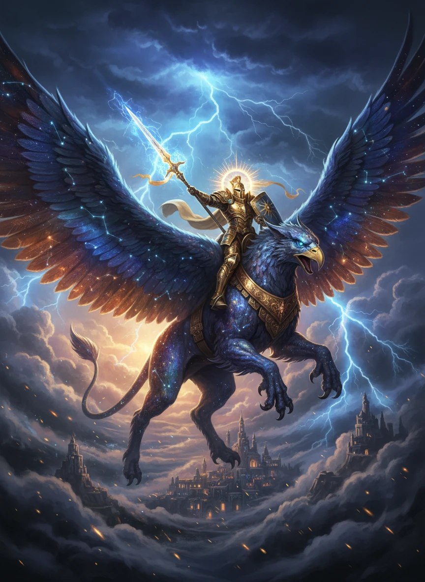 A knight rides a celestial griffin through storm-lit skies in a dramatic fantasy art generator composition. Lightning silhouettes wings and armor as clouds part below. The image conveys motion, heroism, and divine power. heroic fantasy, dynamic action, dramatic lighting — NEG: motion blur, flat anatomy, low detail, muted colors, realism, artifacts, logo