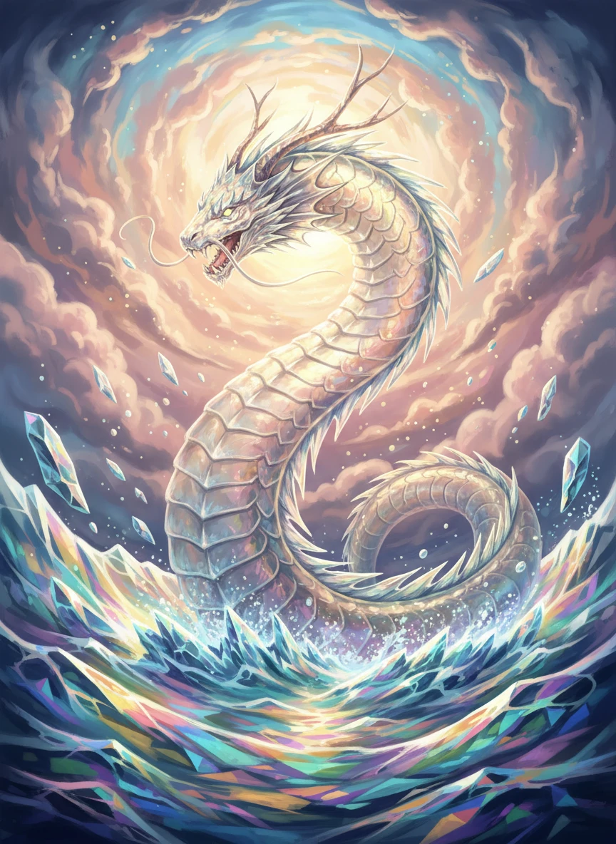 A translucent sea serpent rises from crystalline waters, illustrated through a fantasy art generator style. Sunlight refracts through its body, scattering rainbow hues across the waves. The feeling is majestic and otherworldly. fantasy creature, vibrant color, ethereal — NEG: muddy colors, flat water, realism, grain, low resolution, text, watermark