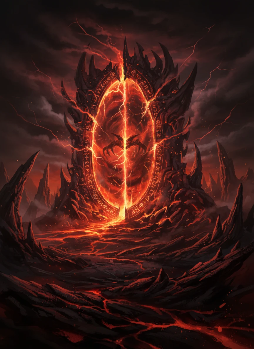 A massive demonic portal cracks open in a volcanic wasteland, crafted as intense fantasy art generator art. Fiery glyphs and shadows hint at unseen horrors beyond. The composition is dark, ominous, and powerful. dark epic fantasy, high contrast, dramatic — NEG: cartoon style, low detail, washed colors, symmetry errors, blur, artifacts, logo