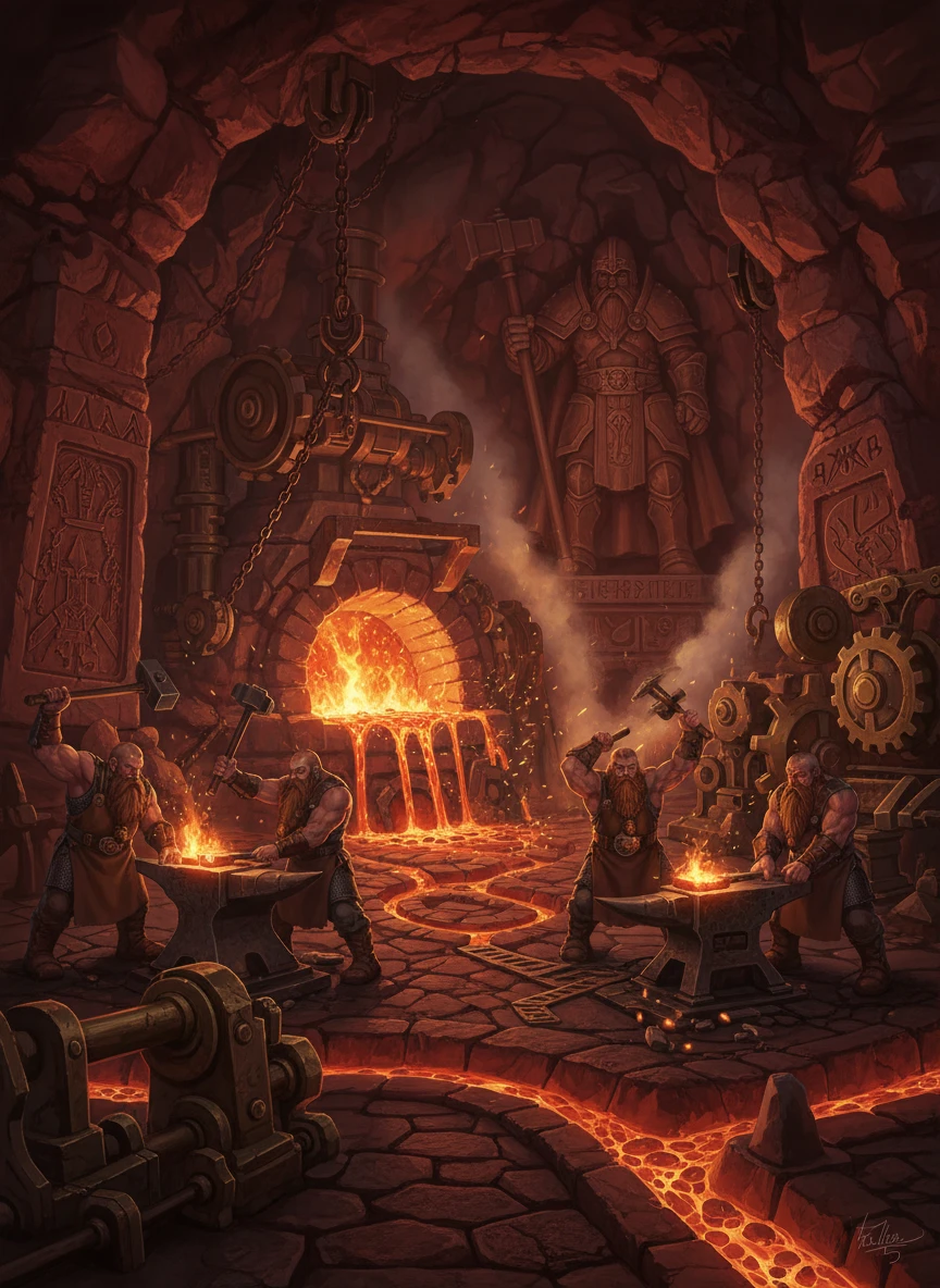 Deep underground, dwarven smiths work a blazing forge carved into living rock, visualized via a fantasy art generator. Molten metal lights stone halls and intricate machinery. The scene feels warm, industrious, and legendary. dark fantasy, cinematic glow, detailed environment — NEG: low contrast, empty scene, modern tools, blur, noise, washed colors, watermark