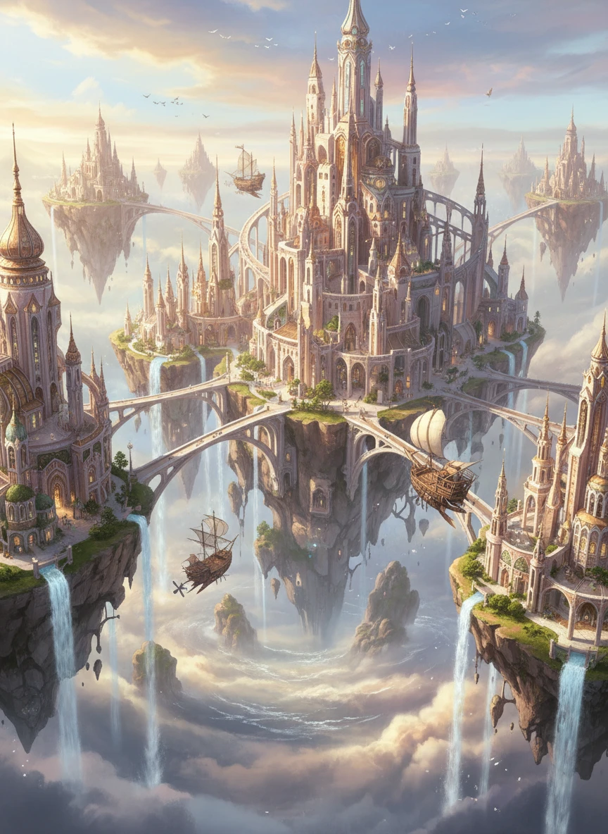 A vast city of spires and bridges floats among the clouds, imagined through a fantasy art generator lens. Airships drift between islands while waterfalls pour into the sky below. The composition emphasizes wonder, scale, and elegant architecture. fantasy landscape, aerial view, luminous — NEG: fog overload, perspective errors, low detail, flat sky, modern buildings, blur, watermark