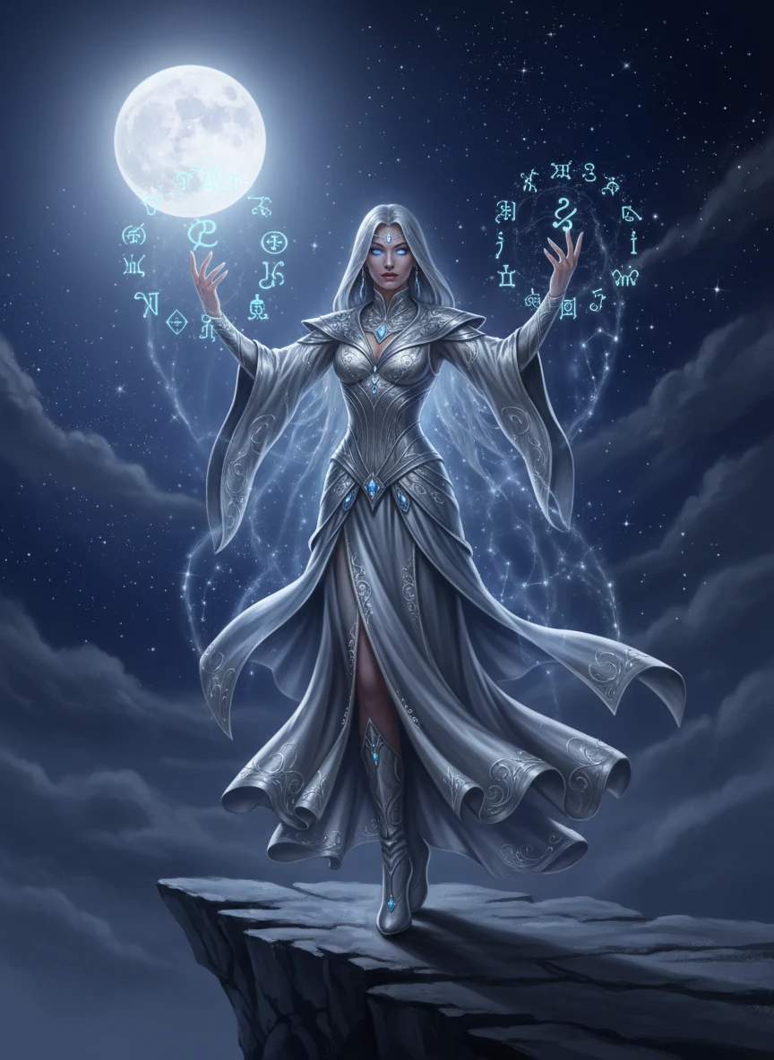 A powerful sorceress stands on a moonlit cliff, silver robes flowing, depicted as refined fantasy art generator artwork. Arcane symbols orbit her hands as stars shimmer behind her. The mood is elegant, mysterious, and celestial. character fantasy, moonlight, magical aura — NEG: stiff pose, extra fingers, dull eyes, grainy texture, realism, text, logo