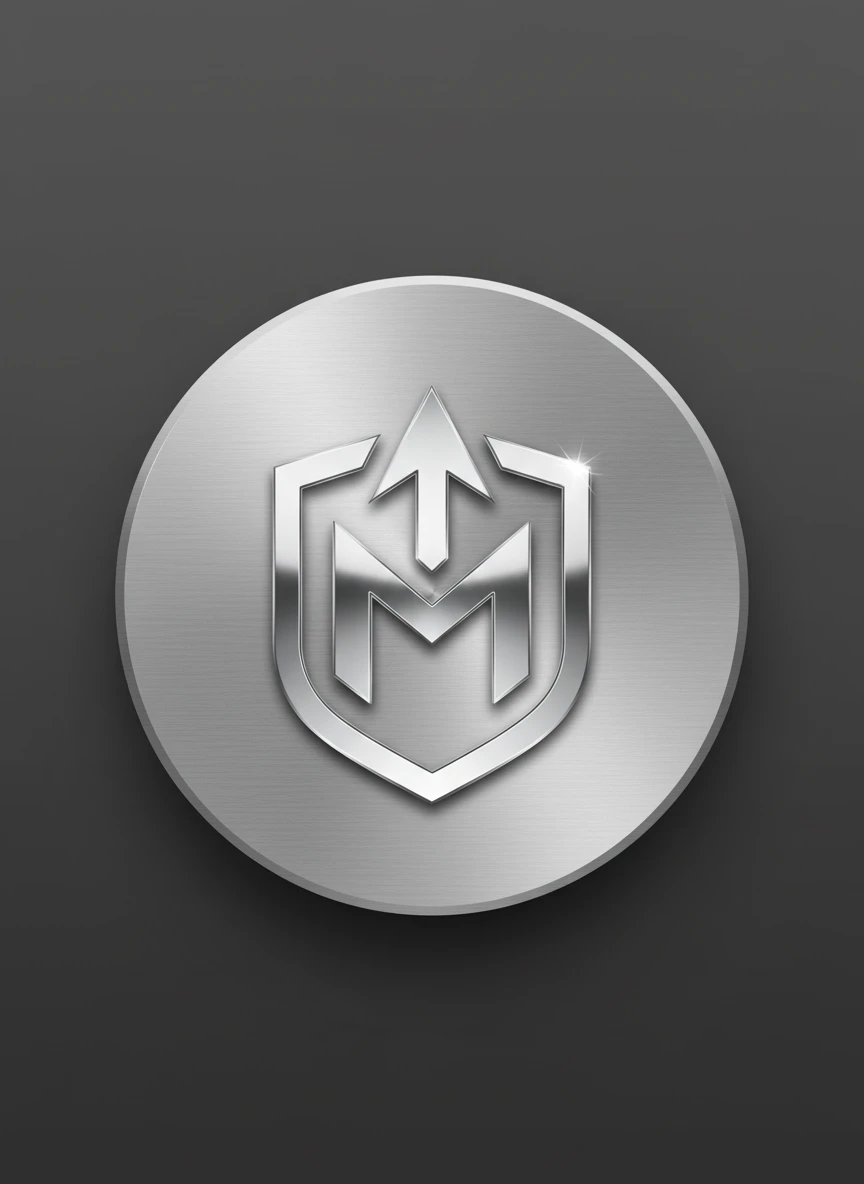 Design a premium metallic website icon using a Realistic favicon generator style with brushed metal texture and subtle reflections. The favicon should feature a strong emblem-like symbol that looks polished and professional. Lighting should highlight the metallic surface while keeping the shape bold and simple for small display sizes. Keep the icon centered and visually balanced. Tags: metallic, premium, emblem, reflective — NEG: matte texture, blur, pixelation, watermark, messy background, noise