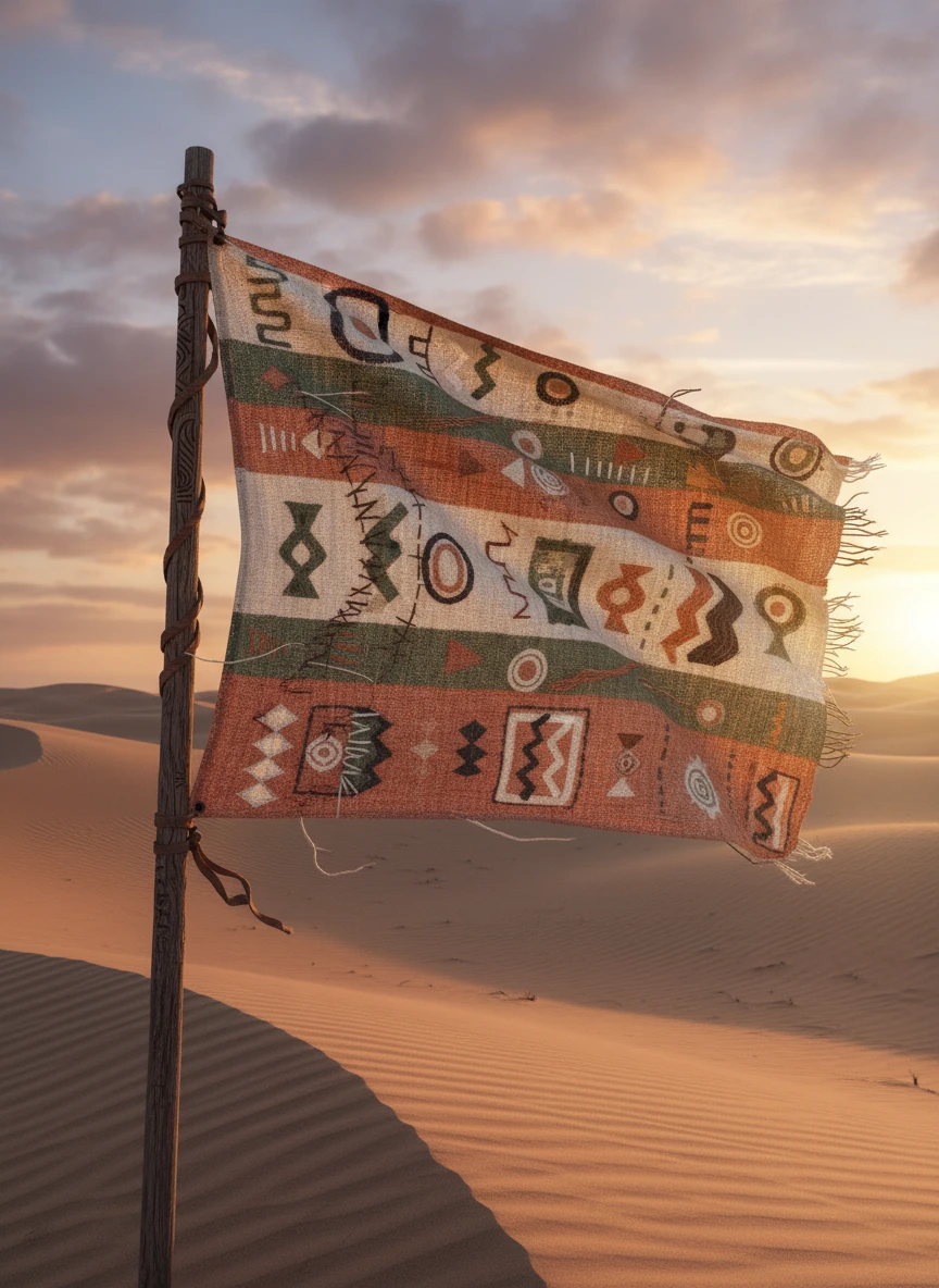 Create a flag generator depicting a nomadic desert tribe’s banner fluttering atop a sand dune. The flag should feature earthy tones, tribal patterns, and fabric textures moving in the wind. Include a golden sunset and soft sand ripples for a serene desert scene. Style: realistic, atmospheric, textured, NEG: blurry, lowres, distorted, cartoon, pixelated, flat, oversaturated, cluttered