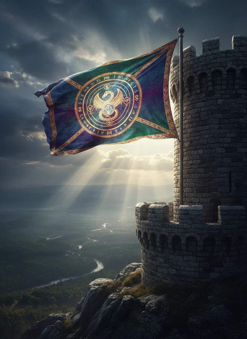 Generate a flag generator scene showing a fantasy kingdom’s banner hanging from a castle turret. The flag should have unique mystical symbols, glowing accents, and a rich color palette, fluttering in a gentle breeze. Add a dramatic cloudy sky with rays of sunlight for an epic effect. Style: fantasy, cinematic, detailed, NEG: blurry, lowres, distorted, watermark, text, cartoon, pixelated, oversaturated