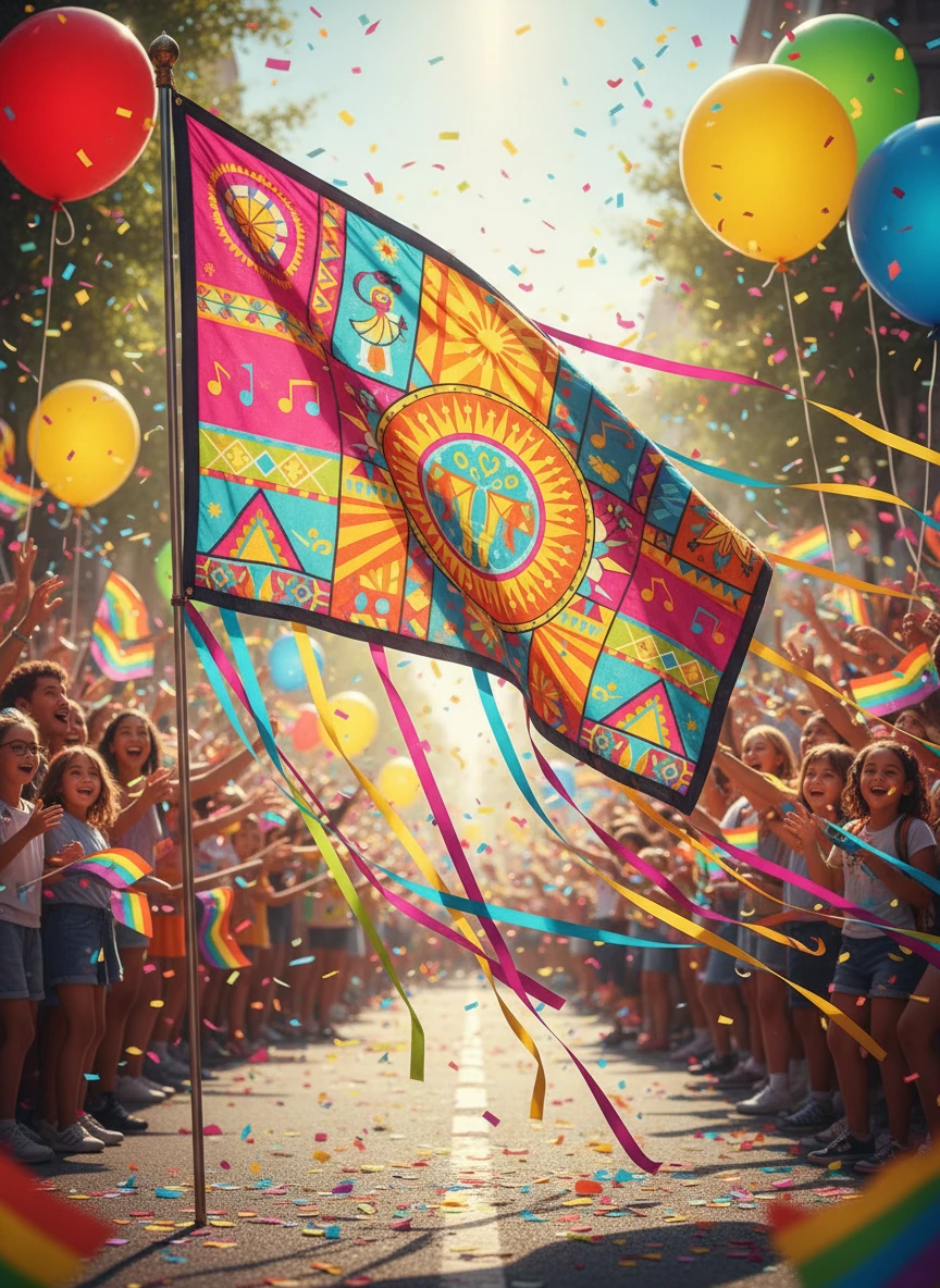 Create a flag generator showing a colorful flag in a lively festival parade. The flag should have bright patterns, festive symbols, and dynamic motion as it waves. Add confetti, balloons, and a crowd in the background for celebratory energy. Style: festive, colorful, dynamic, NEG: blurry, lowres, distorted, dull, dark, cartoon, pixelated, empty