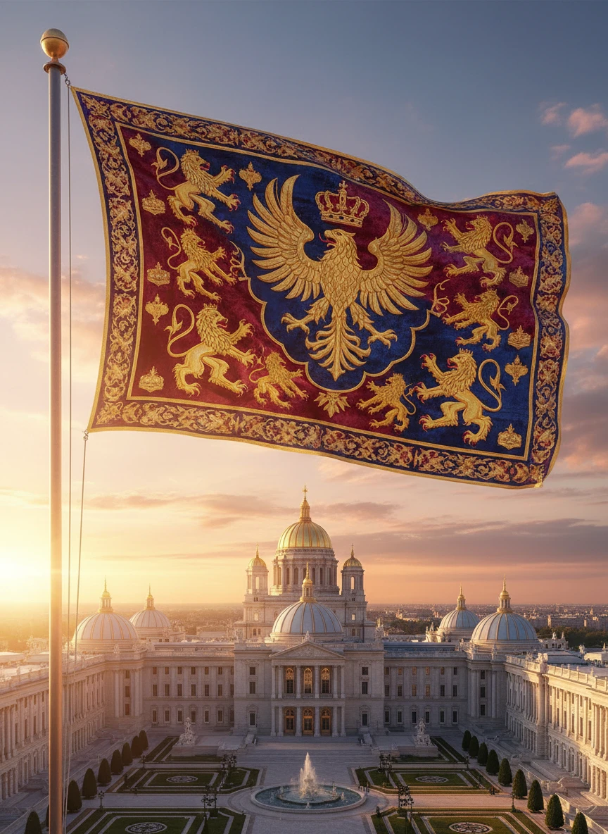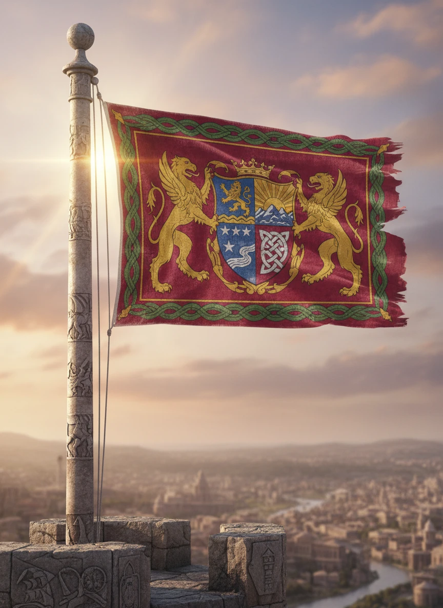 Create a detailed flag generator illustration featuring a historic nation’s flag waving proudly on a tall flagpole. The flag should have intricate emblems, vibrant colors, and a slightly aged texture to reflect its historical significance. Include a soft sky background with gentle sunlight highlighting the fabric folds. Style: realistic, cinematic, detailed, NEG: blurry, lowres, distorted, watermark, text, cartoon, pixelated, oversaturated