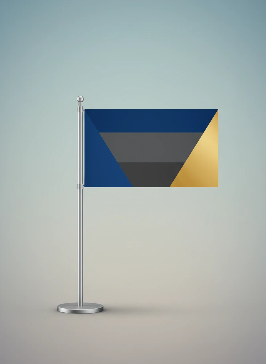 Create a flag generator design for a modern minimalist flag displayed on a sleek metallic pole. The flag should feature bold geometric shapes, a limited color palette, and clean lines. Place it against a simple, soft-gradient background to emphasize modern aesthetics. Style: minimalist, clean, graphic, NEG: blurry, lowres, distorted, messy, cartoon, overcomplicated, pixelated, grainy
