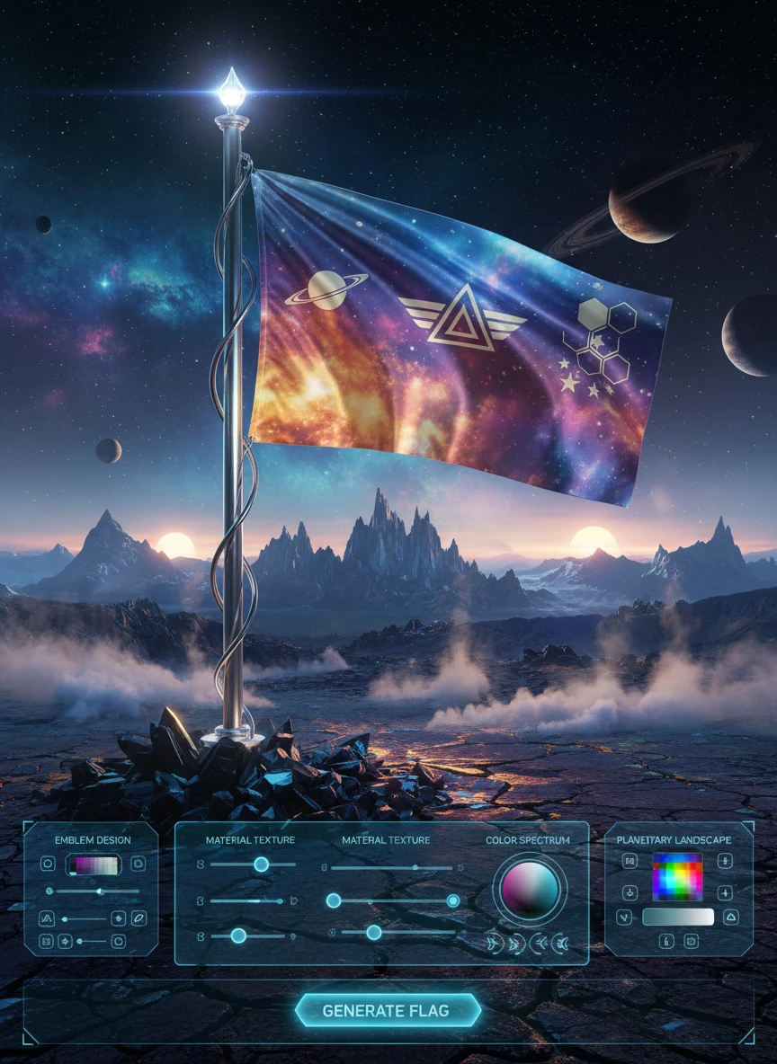 Illustrate a flag generator design featuring a futuristic space mission flag planted on a distant planet. The flag should have sleek emblems, metallic textures, and vibrant cosmic colors. Include stars, planets, and a dramatic horizon to enhance the extraterrestrial scene. Style: sci-fi, futuristic, detailed, NEG: blurry, lowres, distorted, cartoon, flat, pixelated, dull, messy