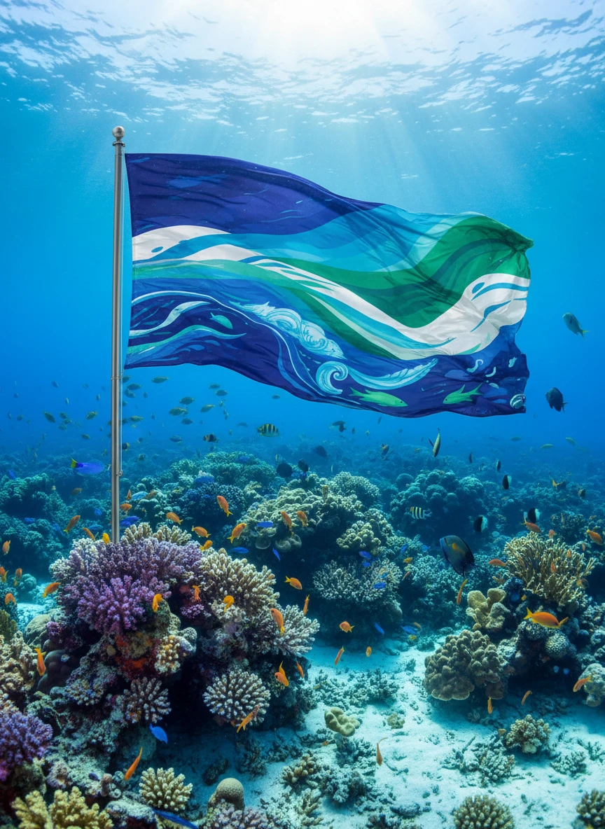 Illustrate a flag generator showing a flag anchored to an underwater coral reef. The flag should have marine-inspired colors, wavy patterns, and appear to ripple with the ocean currents. Include colorful fish and sunlight filtering through the water for a vibrant aquatic scene. Style: underwater, vibrant, realistic, NEG: blurry, lowres, distorted, dark, cartoon, flat, pixelated, overexposed
