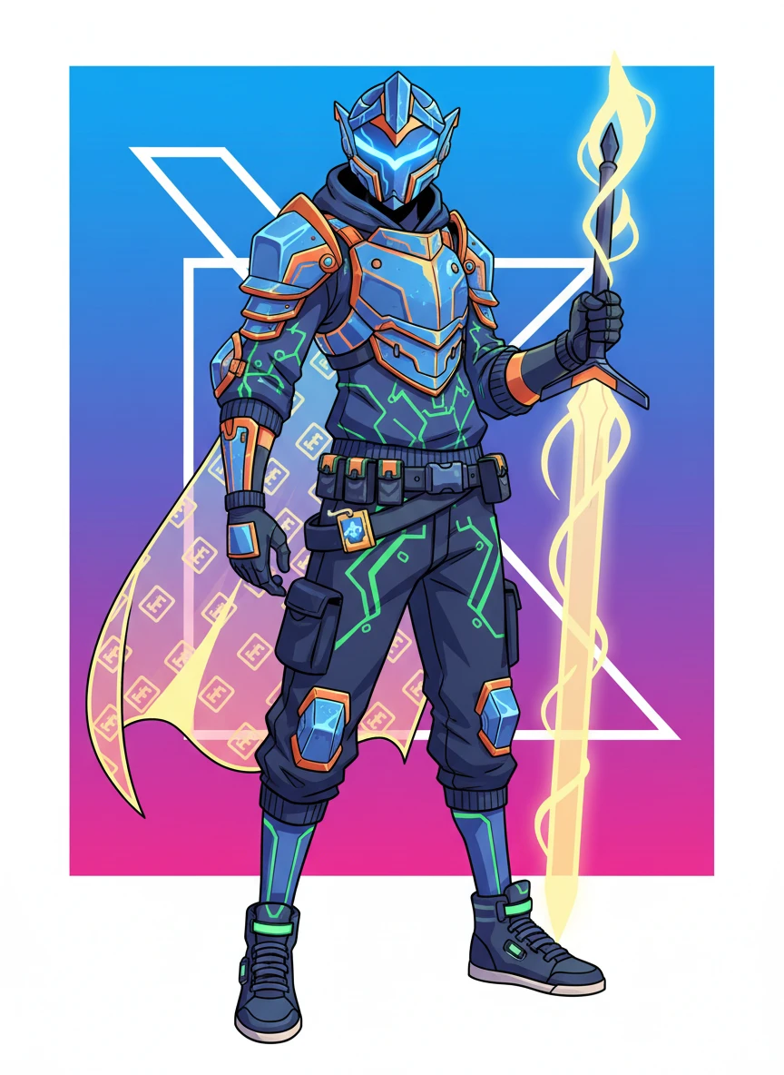 Fortnite Generator shows a themed crossover-style outfit concept, blending fantasy armor with modern streetwear aesthetics. The character stands confidently against a bold gradient backdrop. Clean lines and vivid colors keep the design readable and iconic. concept art, bold colors, clean NEG: overdetail, realism, dull tones, cluttered background, artifacts