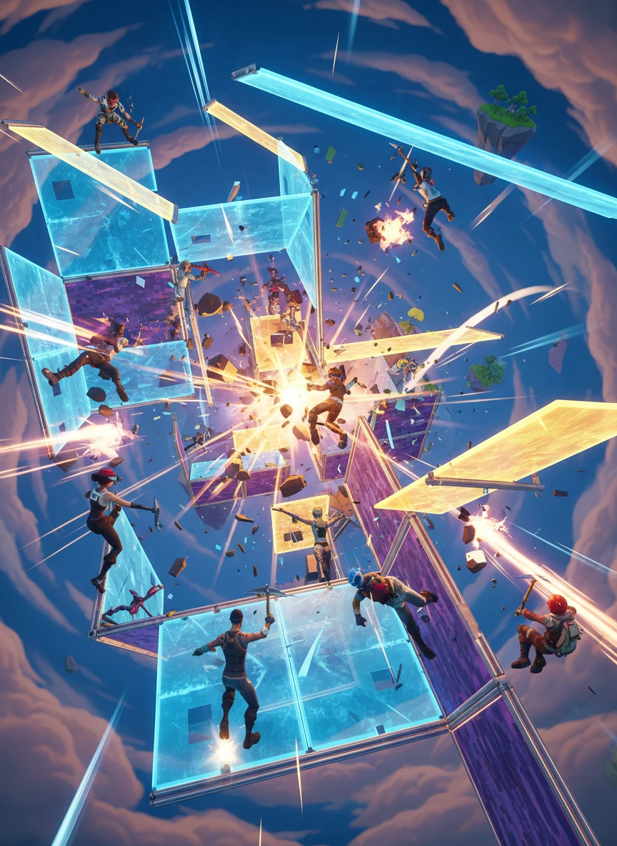 Fortnite Generator creates a chaotic build fight with characters rapidly constructing walls and ramps in mid-air. Bright materials and sharp angles form a layered composition full of depth. The scene captures speed, creativity, and competition. energetic, layered, action-packed NEG: confusing layout, muddy colors, realism, flat depth, noise