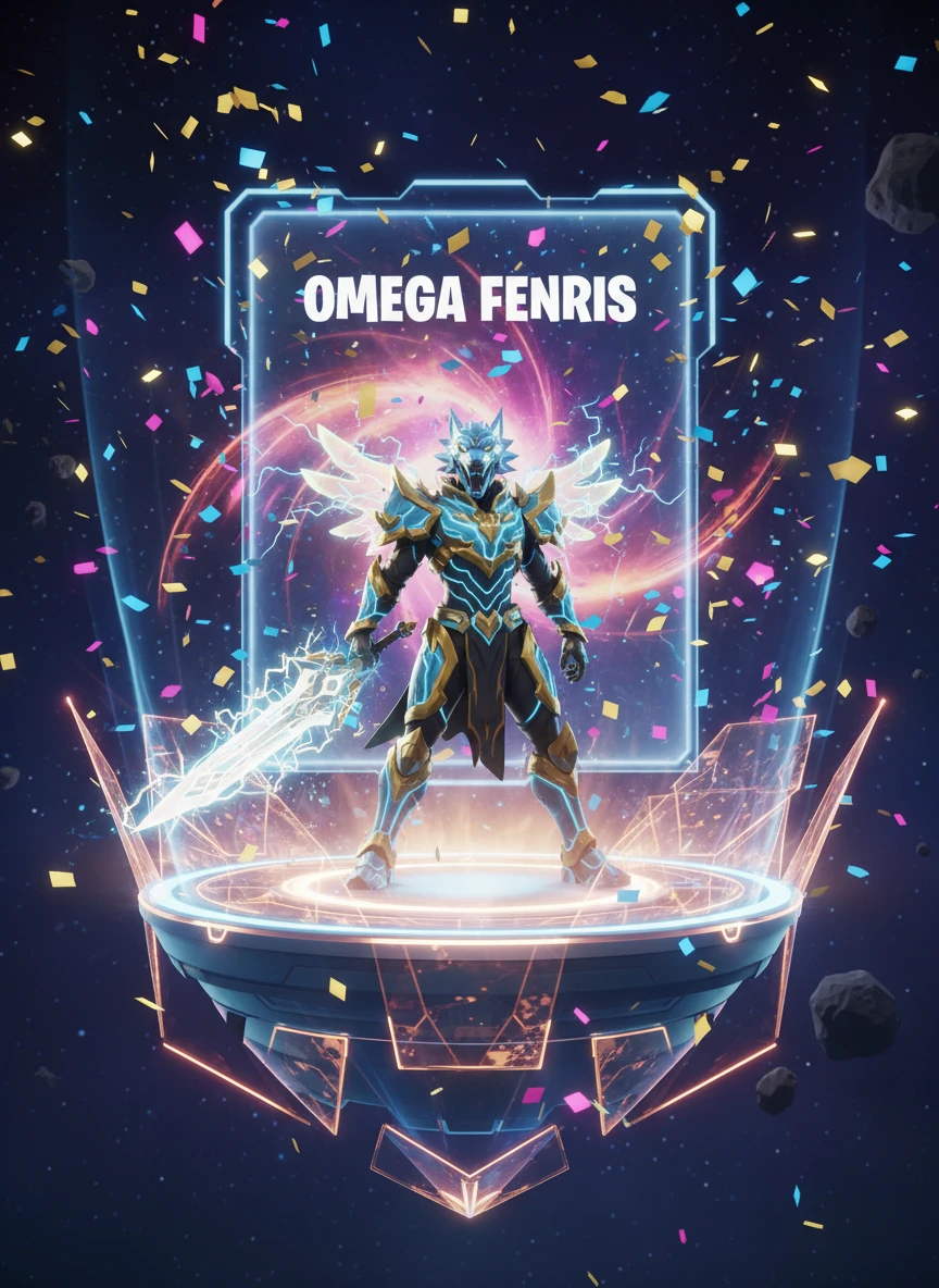 Fortnite Generator illustrates a legendary skin reveal on a glowing platform with confetti and holographic effects. The character design is bold and iconic, meant to feel collectible and heroic. High contrast lighting and crisp outlines enhance the reveal moment. heroic, high-contrast, showcase NEG: soft focus, muted palette, realism, shadows obscuring face, artifacts