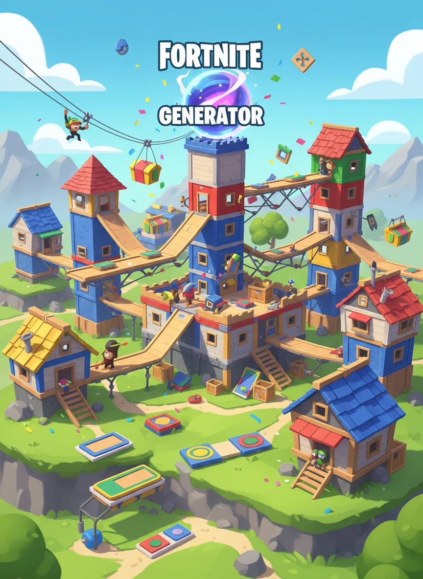 Fortnite Generator presents a whimsical village built from modular structures, ramps, and towers in a playful art style. The scene feels lively and strategic, with bright materials and clean shapes. A cheerful, competitive atmosphere fills the environment. cartoon, clean shapes, bright NEG: cluttered, dark, gritty, realistic textures, grain