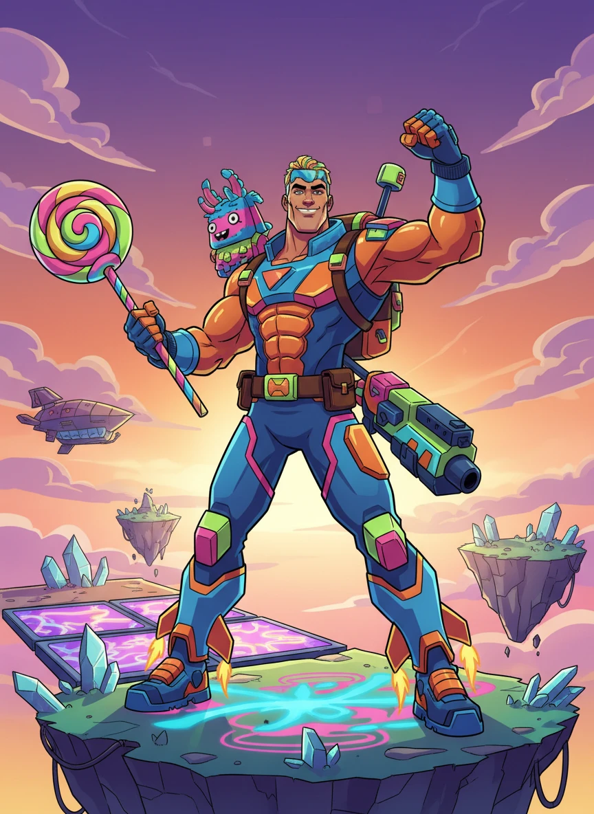 Fortnite Generator creates a vibrant hero skin standing on a neon-lit island at sunset, with exaggerated proportions and bold cel-shaded colors. The character wears futuristic armor mixed with playful accessories, striking a confident victory pose. Dynamic lighting and saturated hues emphasize the iconic Fortnite-like energy. stylized, vibrant, cel-shaded NEG: blurry, low-detail, photorealistic, dull colors, noise, artifacts