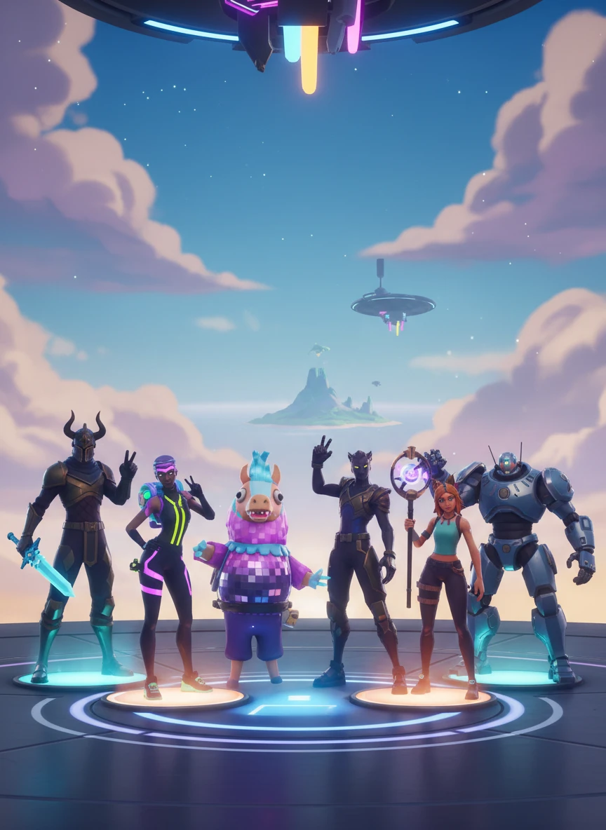 Fortnite Generator visualizes a colorful lobby scene where multiple characters pose together before a match. Each skin has unique silhouettes and accessories, creating instant visual variety. The lighting is soft yet vibrant, emphasizing friendliness and hype. group shot, vibrant, polished NEG: uneven lighting, realism, overlapping faces, blur, noise