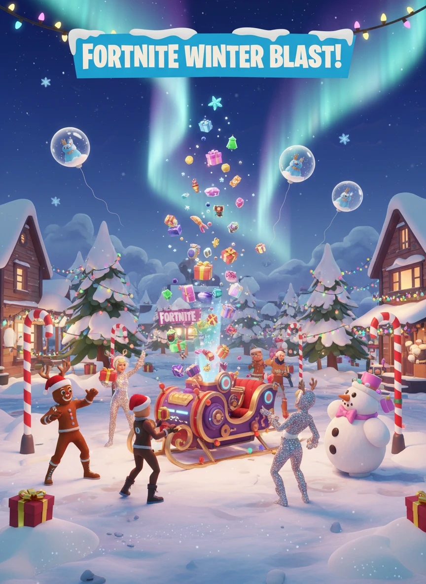 Fortnite Generator designs a fun seasonal event scene with festive props, bright decorations, and themed outfits. Characters interact casually, creating a celebratory atmosphere. The overall look is cheerful, clean, and instantly recognizable. festive, cheerful, colorful NEG: realism, gloomy mood, muted colors, clutter, artifacts