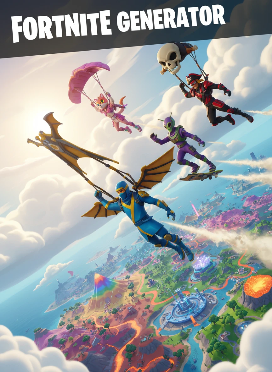 Fortnite Generator shows a squad of characters dropping from the sky with gliders over a cartoon battle royale map. Puffy clouds, bright terrain, and dramatic perspective create a sense of motion and excitement. Each character has a distinct outfit and color theme for visual contrast. dynamic, colorful, action NEG: motion blur, washed-out, realism, flat lighting, distorted anatomy