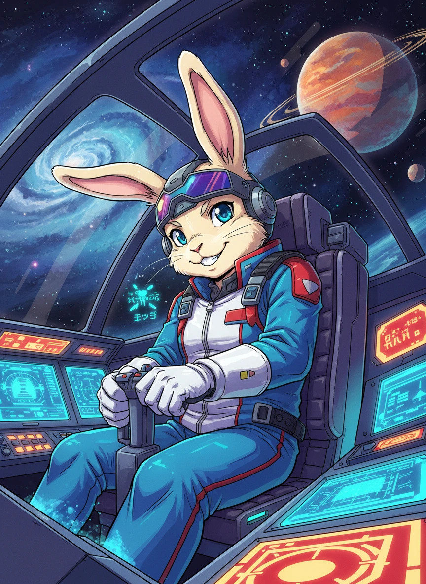 anime inspired anthropomorphic rabbit pilot, adult character, sci fi flight cockpit, dynamic angle, glowing controls, energetic mood, clean line art, vibrant colors, expressive eyes, NEG: dull colors, blur, extra fingers, watermark, nsfw