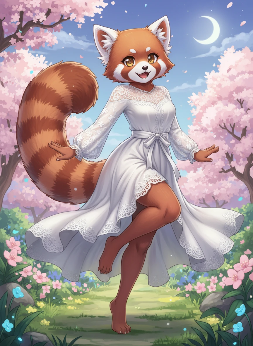 cute anime anthropomorphic red raccoon female, adult fursona, fluffy tail, playful pose, elegant figure, soft lighting, high detail, anime art style, clean line art, expressive eyes, NEG: blurry, low res, western cartoon, extra arms, watermark, nsfw