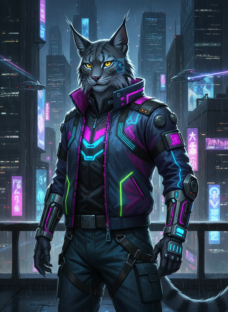 cyberpunk furry lynx, adult anthropomorphic lynx, neon jacket, city night, tech implants, anime cyberpunk style, sharp focus, dramatic lighting, NEG: blur, noise, western cartoon, watermark, nsfw