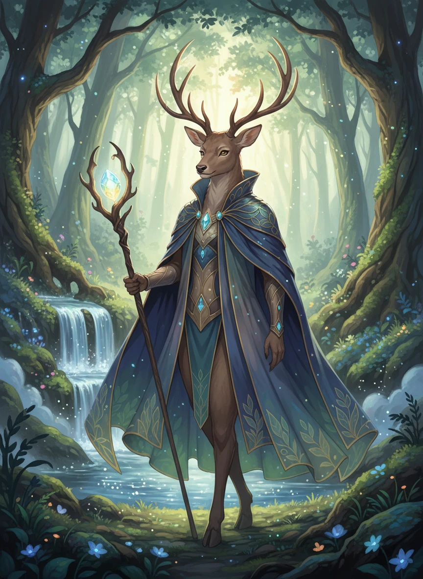 anime inspired deer forest guardian, adult anthropomorphic deer, elegant antlers, flowing cloak, enchanted forest, soft light, ethereal mood, high detail, NEG: grainy, low contrast, western cartoon, nsfw