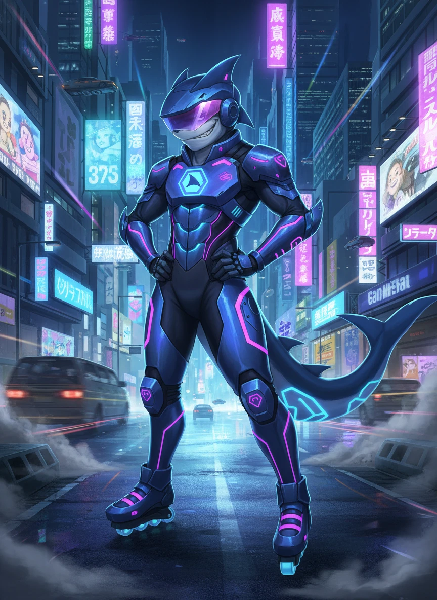 Design an anthropomorphic shark character dressed as a futuristic street racer. Neon racing suit, night city background, confident attitude. Anime sci-fi style with dramatic lighting.