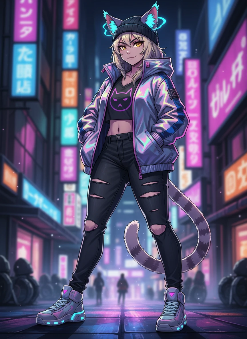 stylish anime cat girl fursona, adult anthropomorphic cat, modern streetwear, urban neon city, cool pose, sharp line art, vibrant palette, NEG: low res, western cartoon, distortion, nsfw