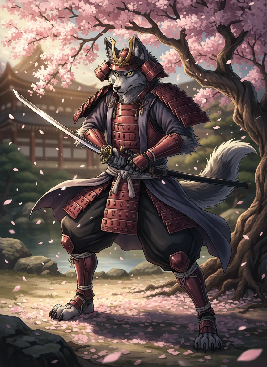 anime fursona wolf samurai, adult anthropomorphic wolf, traditional armor, katana, dramatic pose, cherry blossoms, cinematic angle, epic lighting, sharp focus, high detail, NEG: blur, mutated hands, western cartoon, artifact, nsfw