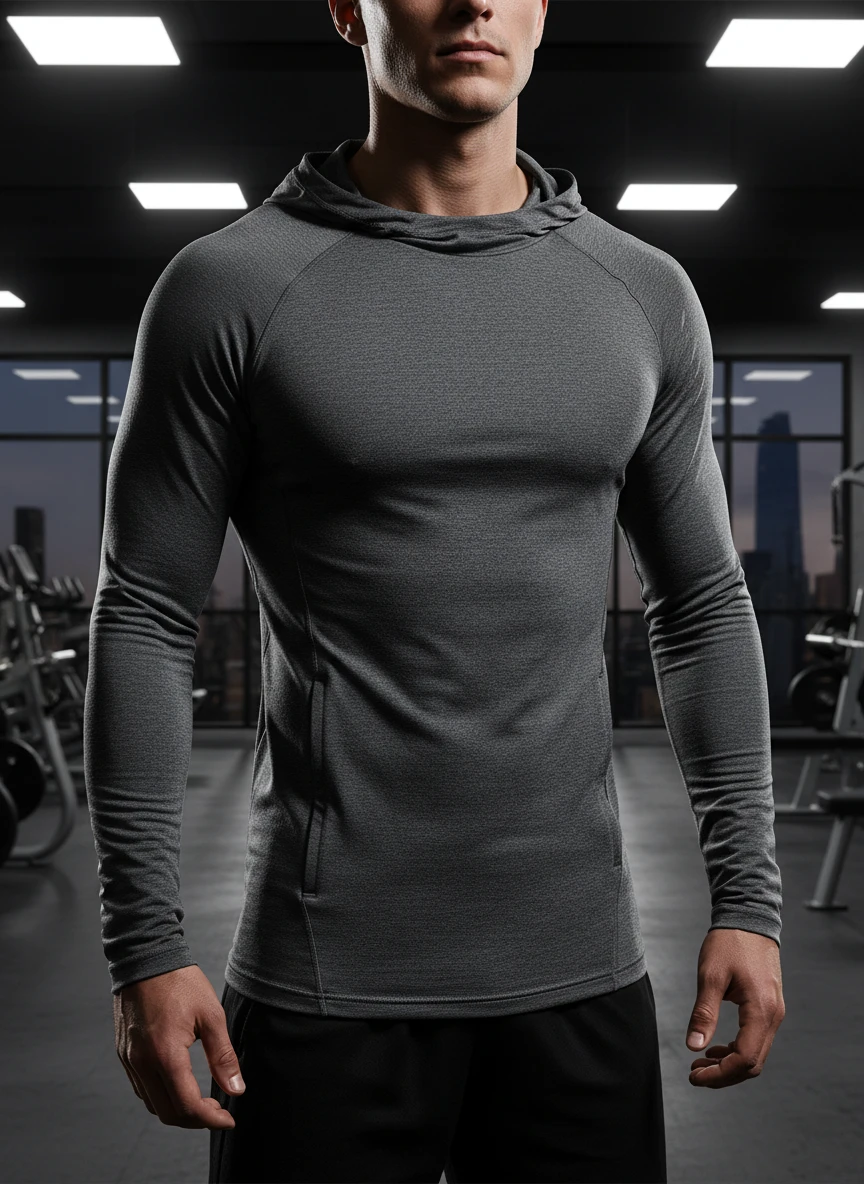 Realistic hoodie Generator displaying a fitted performance hoodie made of moisture-wicking fabric inside a modern gym. The material shows fine knit detail, stretch lines around shoulders, and realistic contouring around the torso. Overhead gym lighting reflects subtly on the fabric surface without glare. Ultra-detailed, high contrast, photorealistic apparel — NEG: glossy plastic look, distorted body, flat lighting, low resolution, exaggerated muscles, artifacts, duplicate features