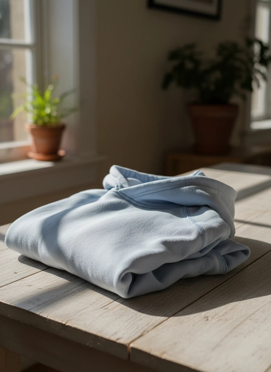 Realistic hoodie Generator featuring a light pastel hoodie casually folded on a wooden table near a window. Natural daylight streams in, casting soft shadows and highlighting the cotton weave texture and relaxed folds. The hoodie appears comfortable, slightly oversized, with authentic seam alignment. Soft lighting, photorealism, cozy aesthetic — NEG: harsh contrast, unrealistic wrinkles, oversharpened edges, low detail, color distortion, fabric clipping, extra hoods