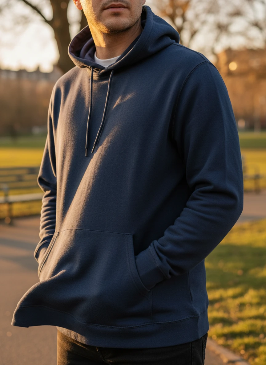 Realistic hoodie Generator capturing a navy blue hoodie worn by a model standing in a park during golden hour. The hoodie fabric reacts naturally to a gentle breeze, showing realistic creases and soft highlights from sunlight. The background is slightly blurred for depth of field while maintaining focus on texture and stitching. Cinematic lighting, natural tones, high realism — NEG: cartoon style, harsh shadows, unrealistic anatomy, low detail, washed out colors, blur, extra limbs
