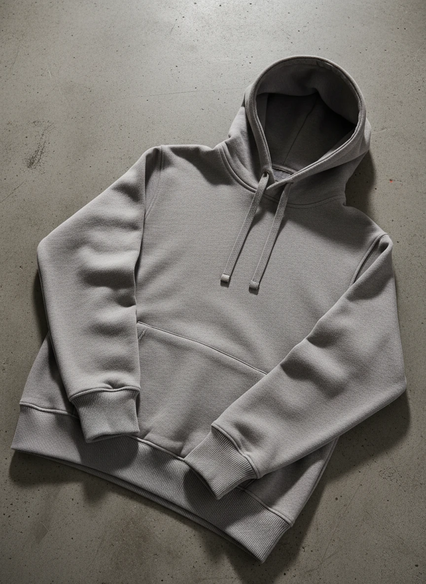 Realistic hoodie Generator showcasing a premium cotton hoodie laid flat on a concrete urban backdrop. The fabric texture is highly detailed, with visible stitching, ribbed cuffs, and a soft fleece interior subtly exposed at the collar. Neutral gray color with natural folds and realistic shadows under soft daylight. Photorealistic, studio clarity, ultra-detailed fabric — NEG: blurry, cartoon, low resolution, distorted proportions, oversaturated, unrealistic texture, extra sleeves